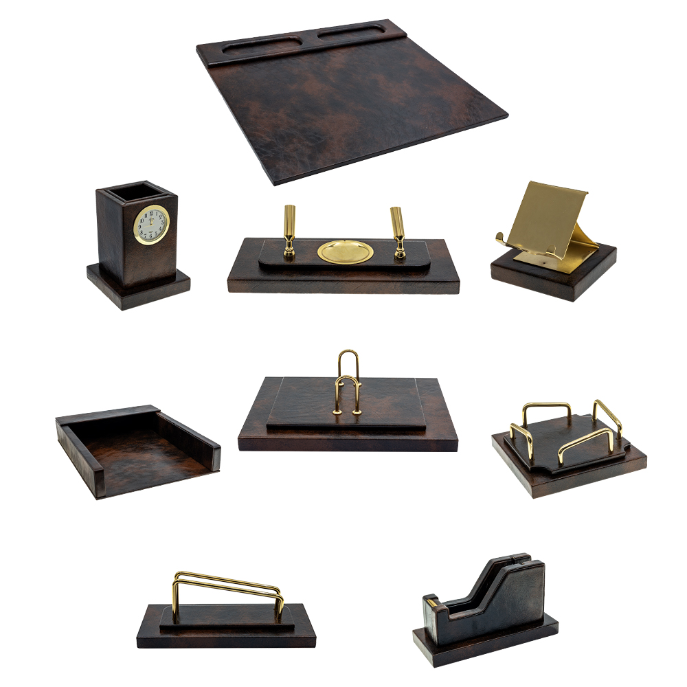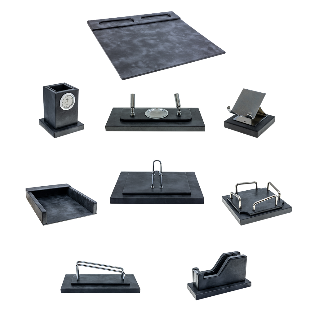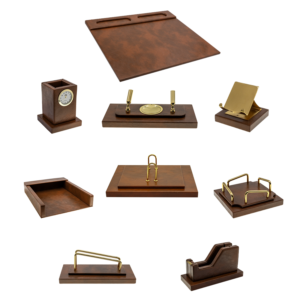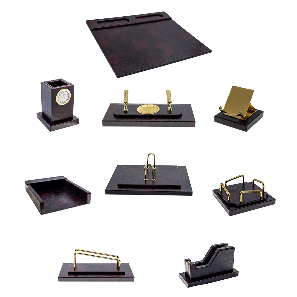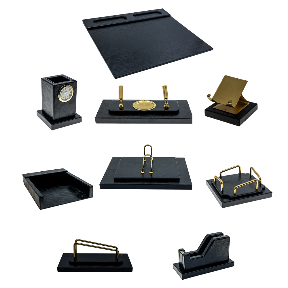 ست رومیزی مدیریتی "آریا" با 9 تکه از جنس چرم وگان درجه یک طراحی شده است. این ست با ظرافت و زیبایی خاصی برای استفاده در دفاتر کار حرفهای طراحی شده و شامل موارد زیر است: