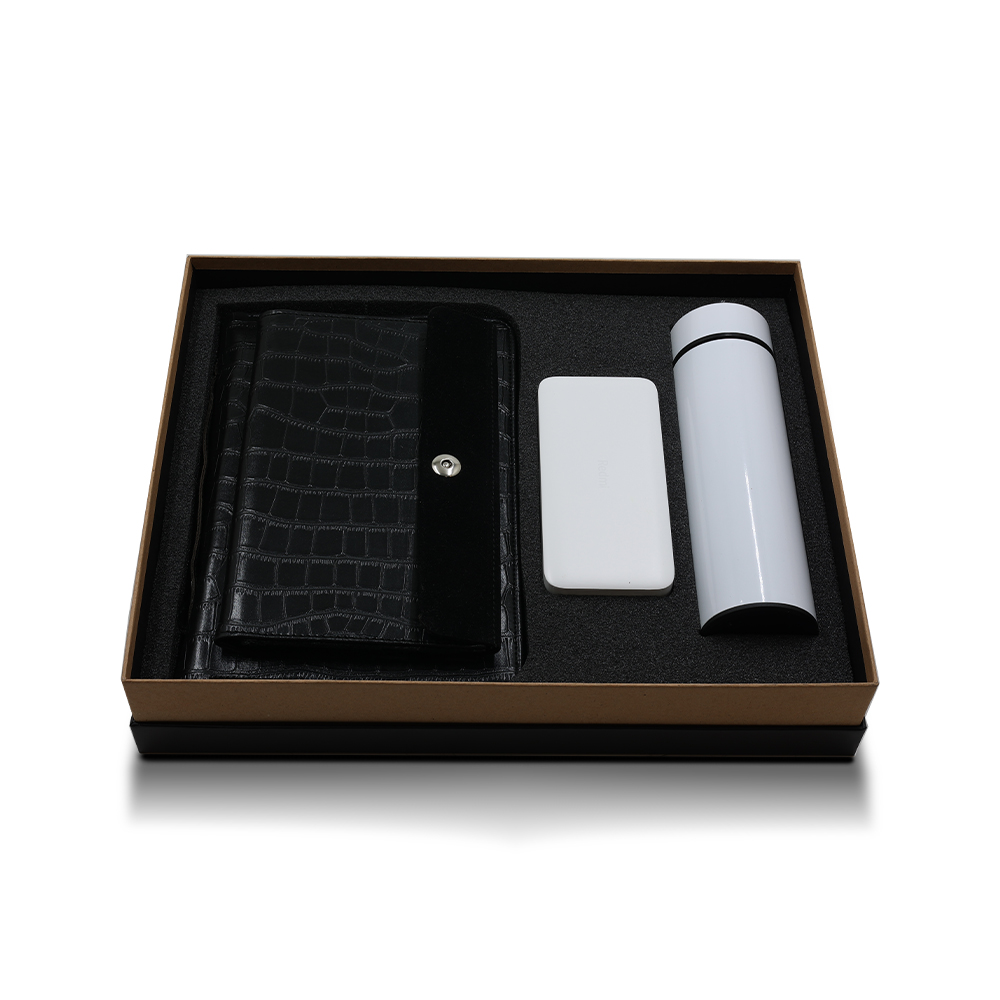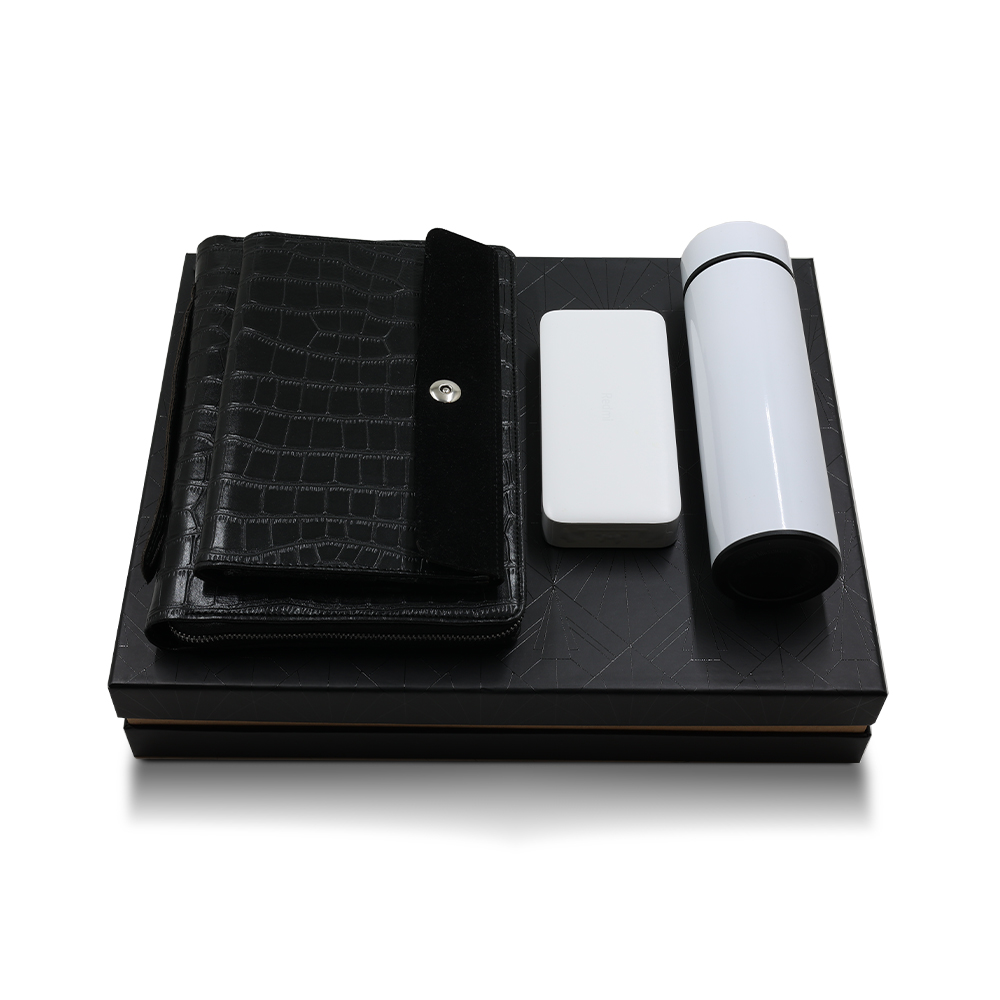 این مجموعه شامل کیف پاسپورتی مدیریتی، پاوربانک 10000 میلیآمپرساعتی با قابلیت شارژ سریع، فلاسک درجهدار، و سالنامه ست است. ترکیبی از کاربرد و زیبایی که برای افراد پرمشغله و مدیران طراحی شده است.