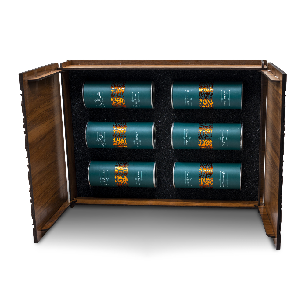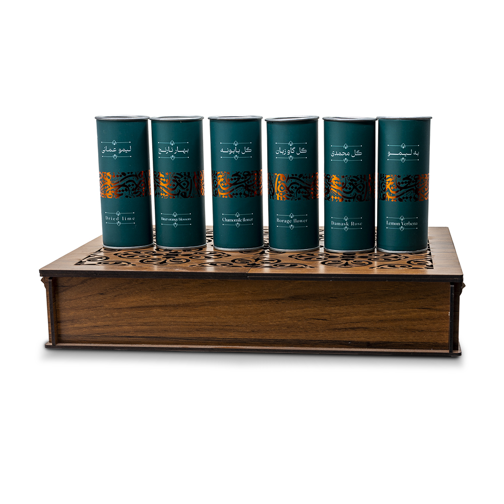 باکس دمنوش یک مجموعه زیبا و کاربردی شامل قوطیهای استوانه ای مسکوب داخل متالایز ، دمنوش در طعمهای متنوع مانند بهلیمو، بهار نارنج، گل محمدی، گل بابونه و لیمو عمانی است. این مجموعه در یک جعبه چوبی با طراحی لیزری قرار دارد و با ساک دستی ارائه میشود. مناسب برای هدیه دادن به عزیزان و استفاده در محیطهای کاری و خانگی.